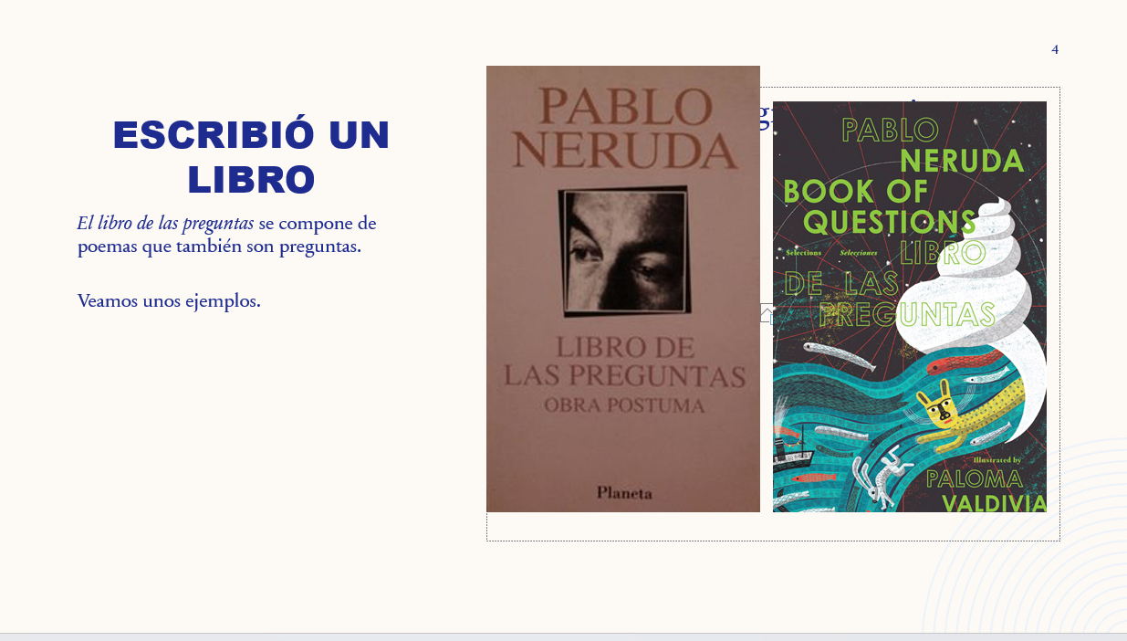 Mini-lesson (3 mins): To continue with the introduction, the teacher should give a brief introduction about the life and work of Pablo Neruda, as well as the book in question.