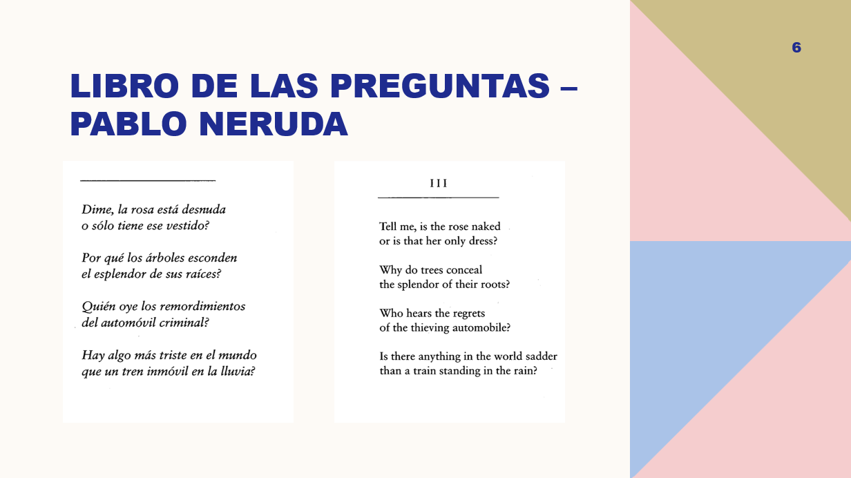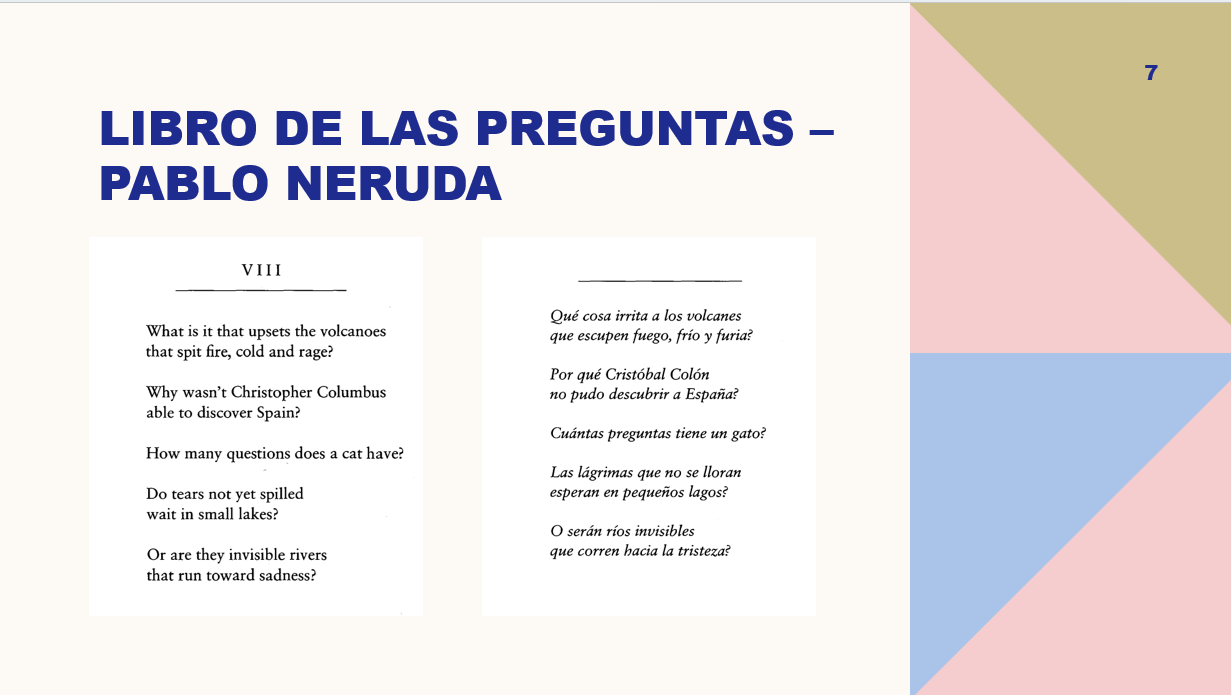 Work in pairs (15 mins): Each team should write three questions that try to resemble Neruda’s style. In this way, each one will practice the way of asking questions. Share: Each team will share their three questions and the rest of the class will vote for their favorite. At the end, a collective poem can be created with the students’ questions.
